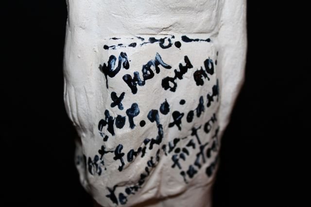 A white sculpture of a girl’s head and upper torso with handwritten text on it. View fullsize